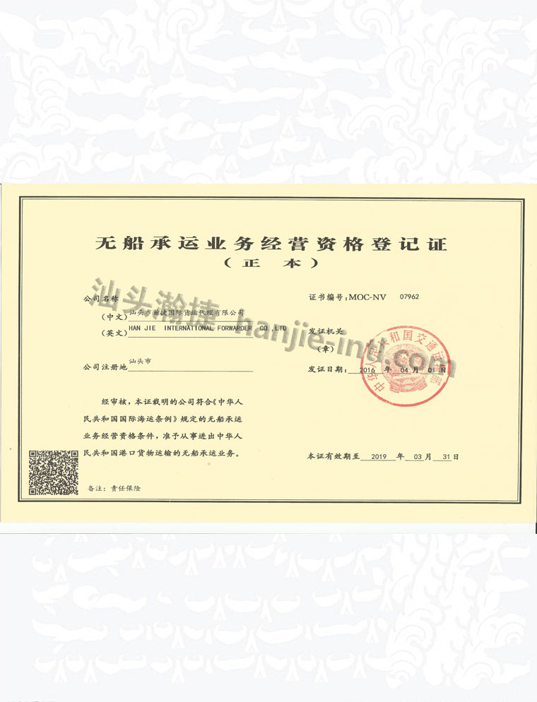 无船承运业务经营资格登记证